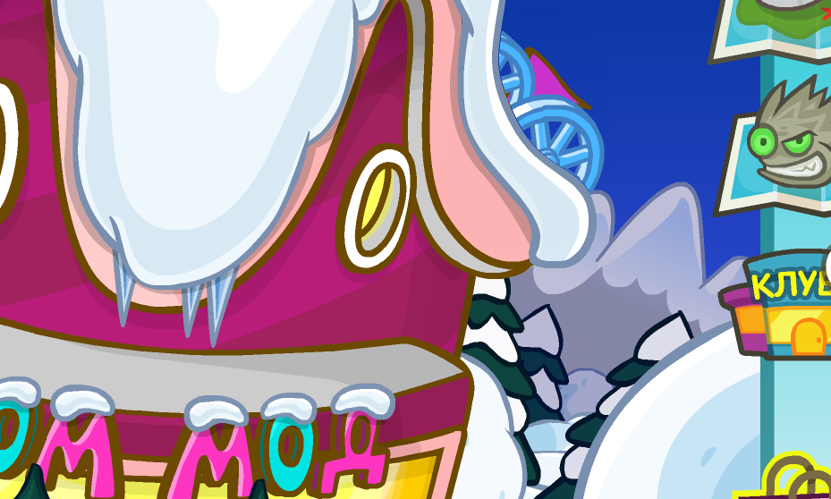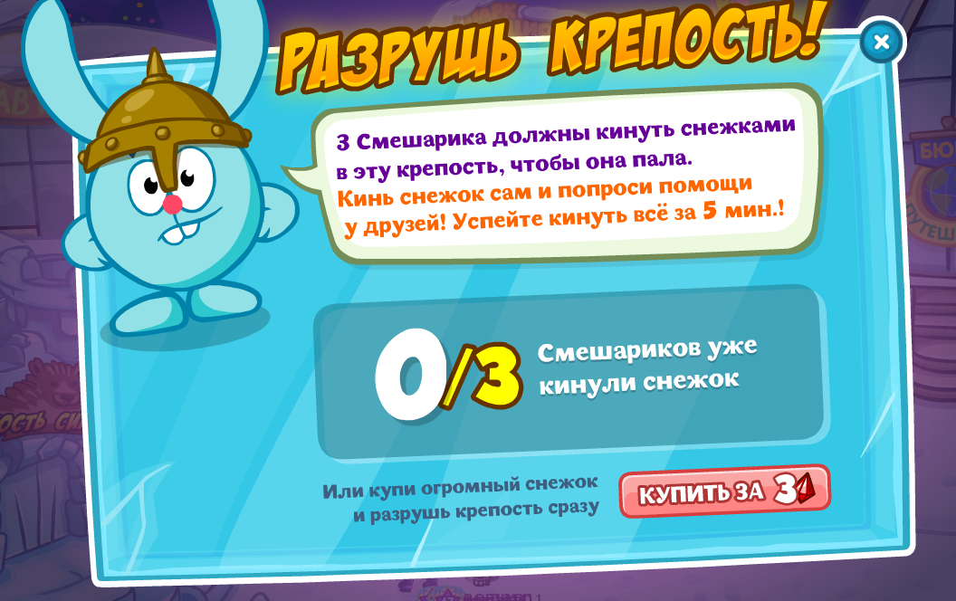 3 смешарика должны кинуть снежнками в эту крепость, чтобы она пала. Кинь снежок сам и попроси помощи у друзей! Успей кинуть всё за 5 мин.!