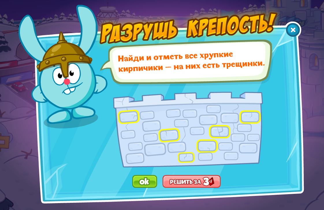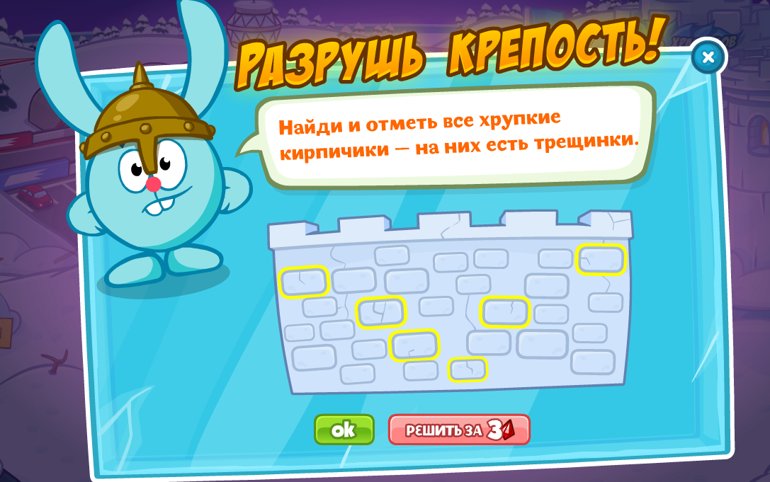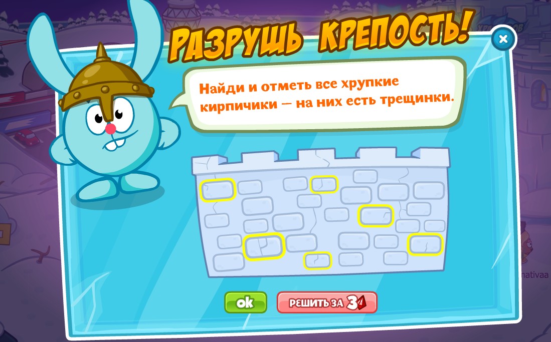 Найди и отметь все хрупкие кирпичики — на них есть трещинки.