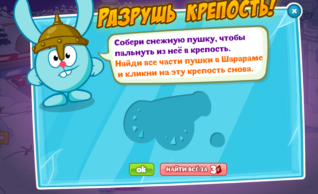 Собери снежную пушку, чтобы пальнуть из неё в крепость. Найди все части пушки в Шарараме и кликни на эту крепость снова.