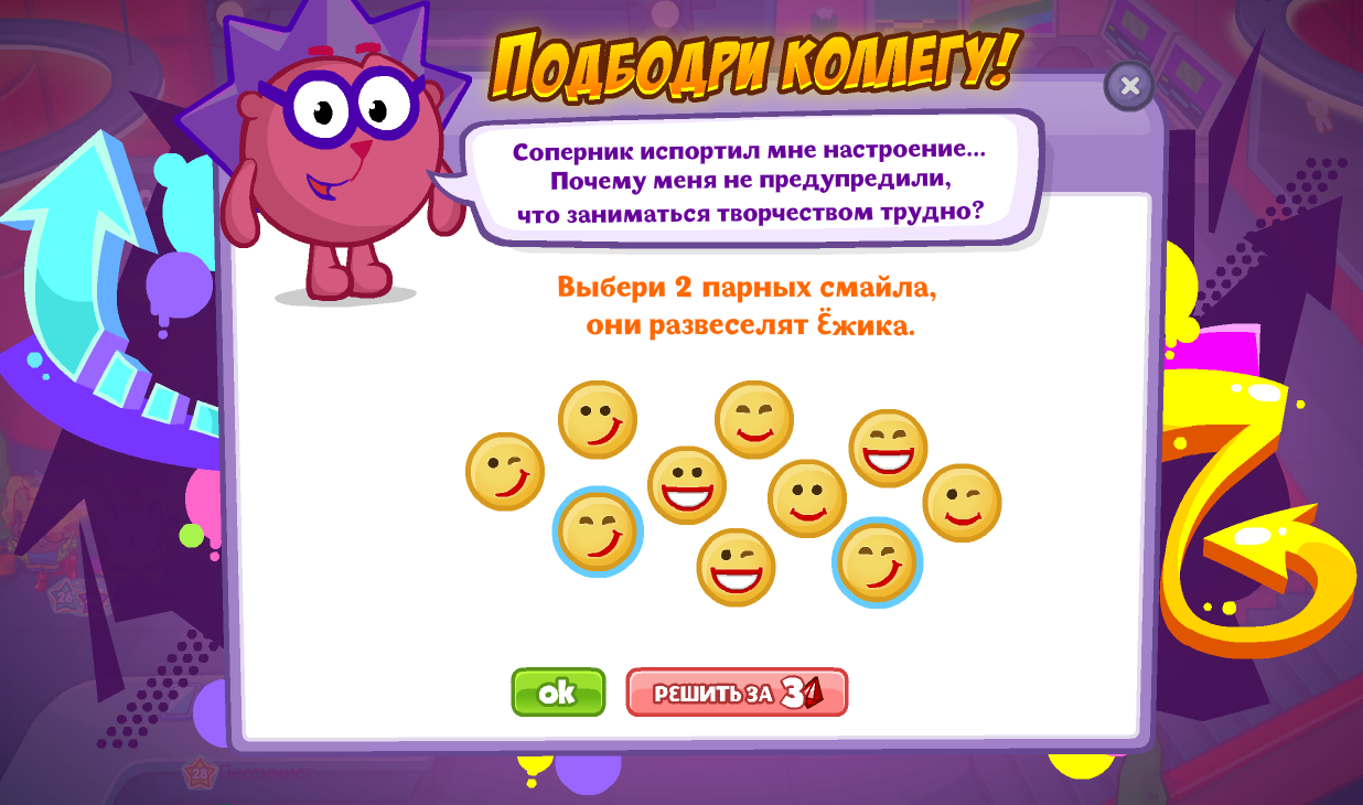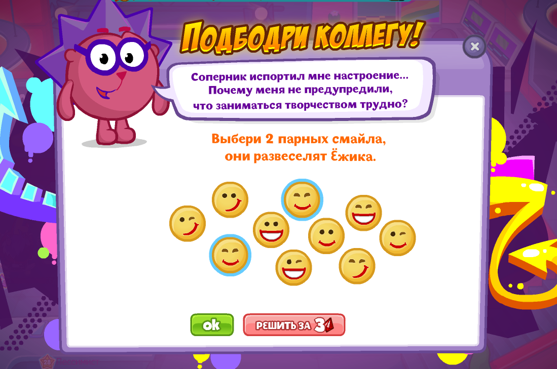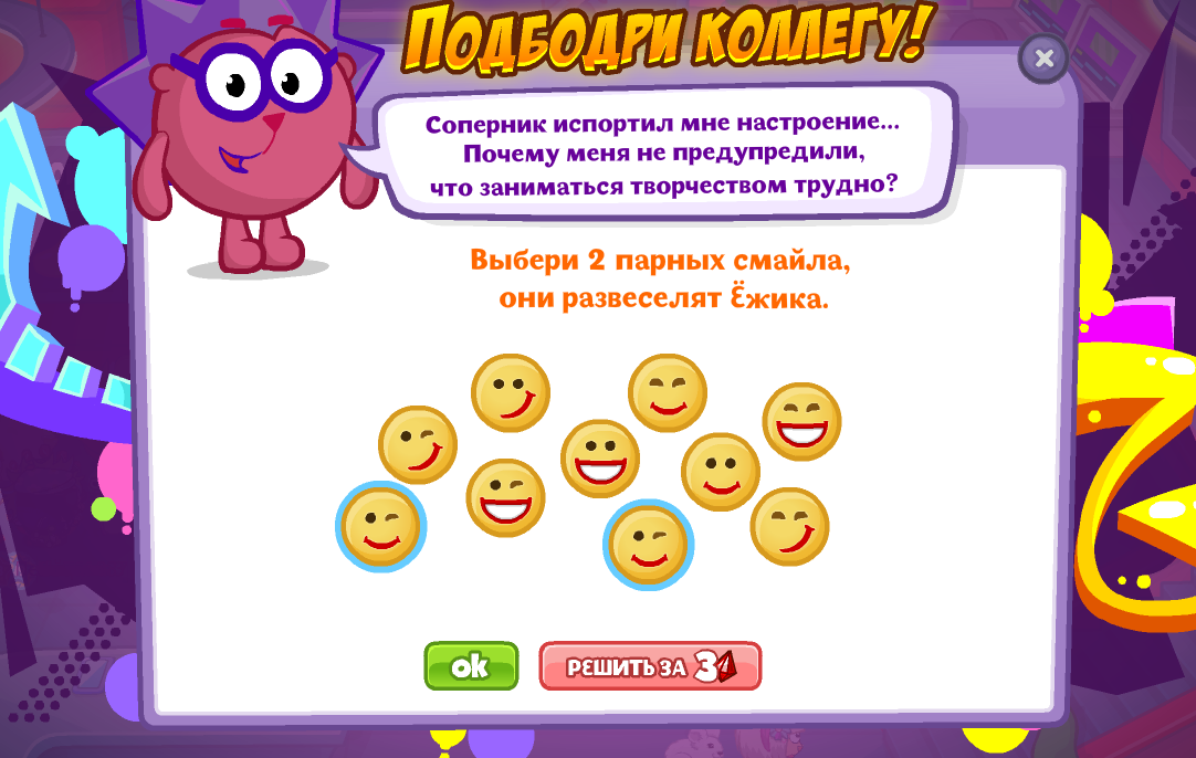 Выбери 2 парных смайла, они развеселят Ёжика.